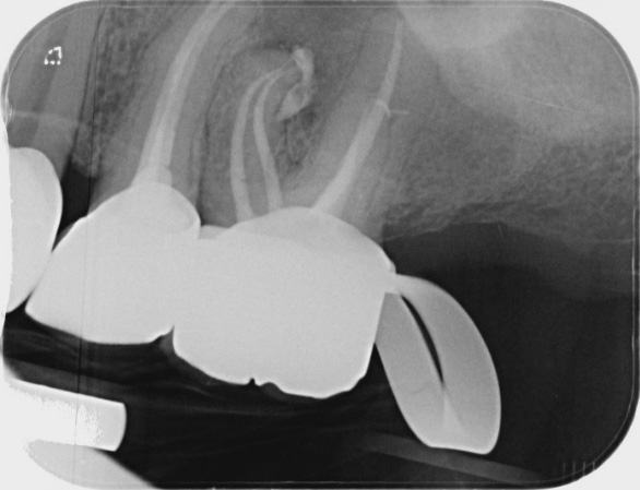 Pre-operatieve radiograph show an apical radiolucency on the mesiobuccal root and a small one on the discobuccal root. Diagnosis was apical abces due to pulpal necrosis.