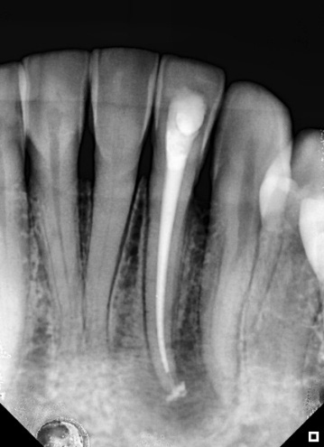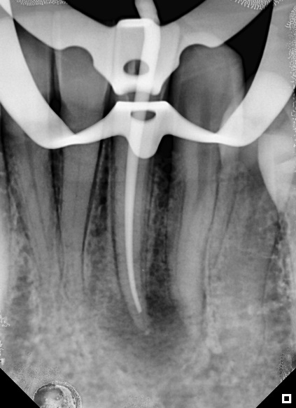 After 30 days, the patient returned and a new periapical radiograph was taken before the intracanal dressing was removed. This radiograph revealed that the periapical lesion had recovered (Figure 3). The intracanal dressing was removed with NaOCl irrigation, followed by a final rinse with EDTA and NaOCl, which was boosted with Easyclean.