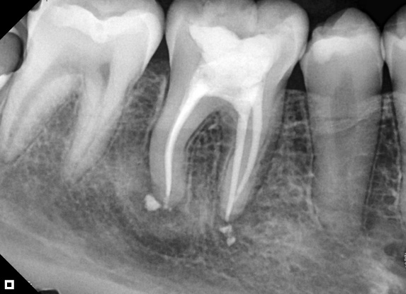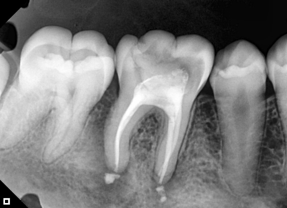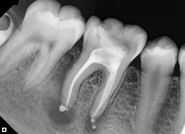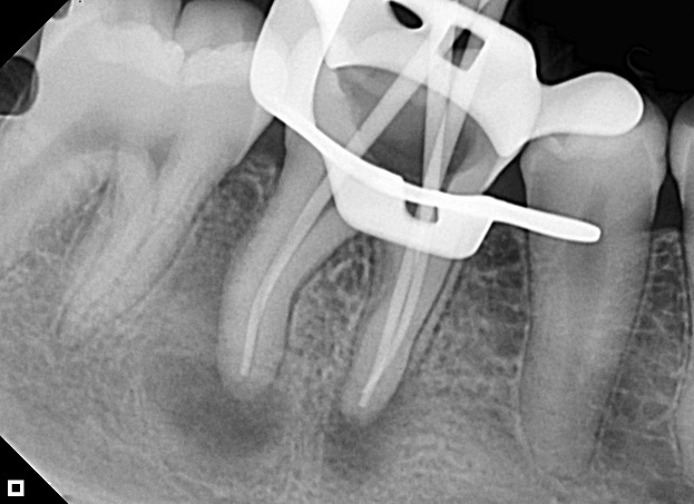 A 25-year-old female patient was referred to the Endodontics Specialization course at the Escola Educação Inteligente – Uningá (Londrina, Paraná, Brazil) for evaluation and endodontic treatment of tooth 46 (lower right first molar). Clinical and radiographic examinations (periapical radiography) were performed, as well as anamnesis, and a coronary opening was found. The tooth was asymptomatic at the time, and the periapical lesion on element 46 was clearly visible with radiography (Figure 1), indicating pulp necrosis.