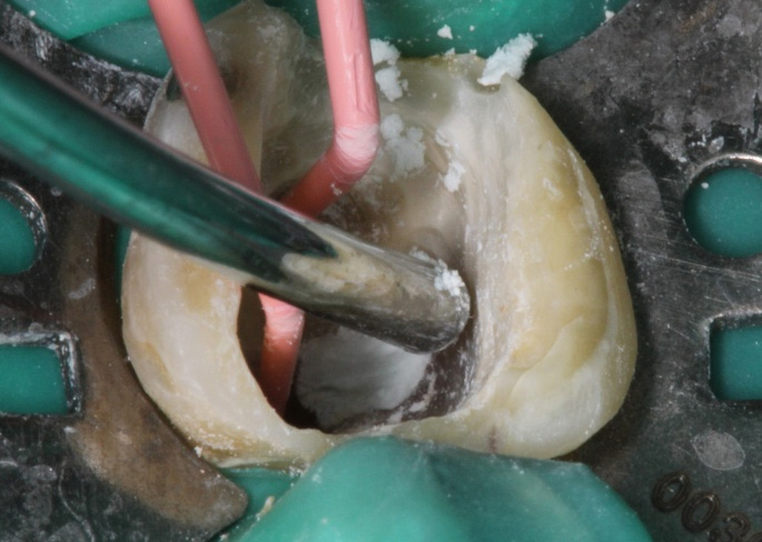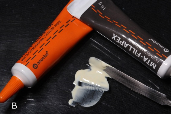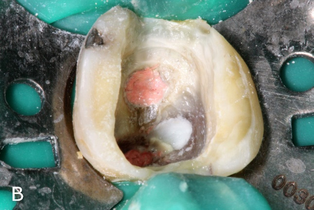 The restoration was removed using a round and conical safe tip bur (Endo Z, Angelus). It was possible to verify the presence of whitish material in the mesial root (Figure 2A). The material was removed, and the perforation was visualized in the distal portion of the mesial root, close to the canal entrance (Figure 2B).