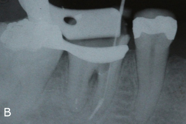 The tooth was provisionally restored. A radiograph was taken (Figure 9A). A post, buildup, and crown restoration were planned for a later session. Twelve months after the completion of treatment, the patient returned for control with no spontaneous pain, and no radiographic changes (Figure 9B).