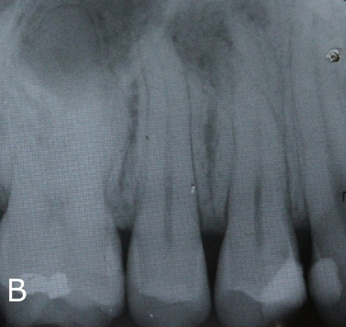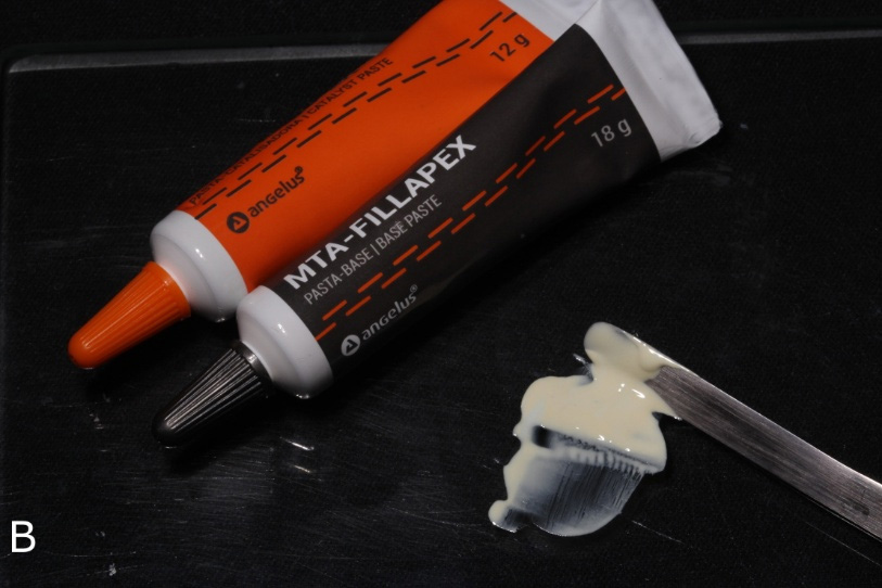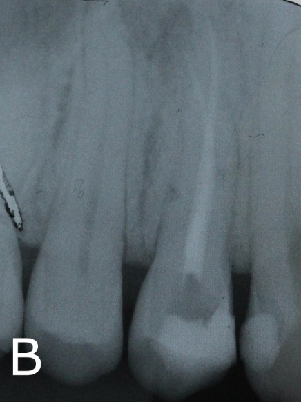 Two dressing changes were performed. After this period, the patient returned for the obturation. Instrumentation was performed with a reciprocating file (Reciproc Blue, VDW). For the obturation, MTA-based bioceramic endodontic cement – MTA-Fillapex – (Angelus Industria de Produtos Odontológicos) was used. The obturation was performed using the lateral and vertical condensation technique, and the tooth was then restored with IRM temporary restorative material (Dentsply).