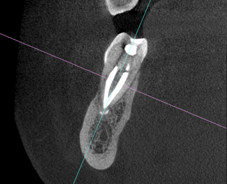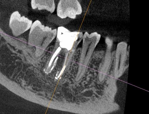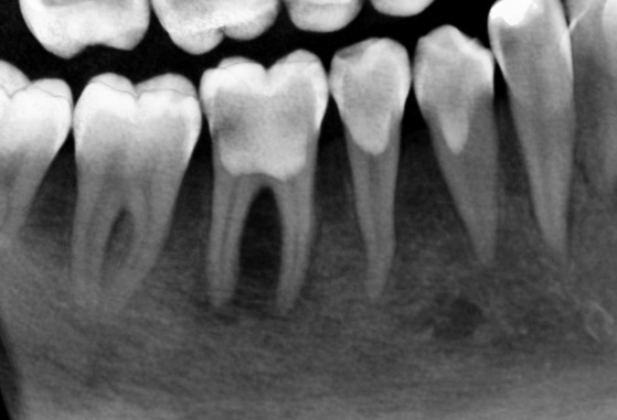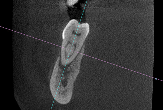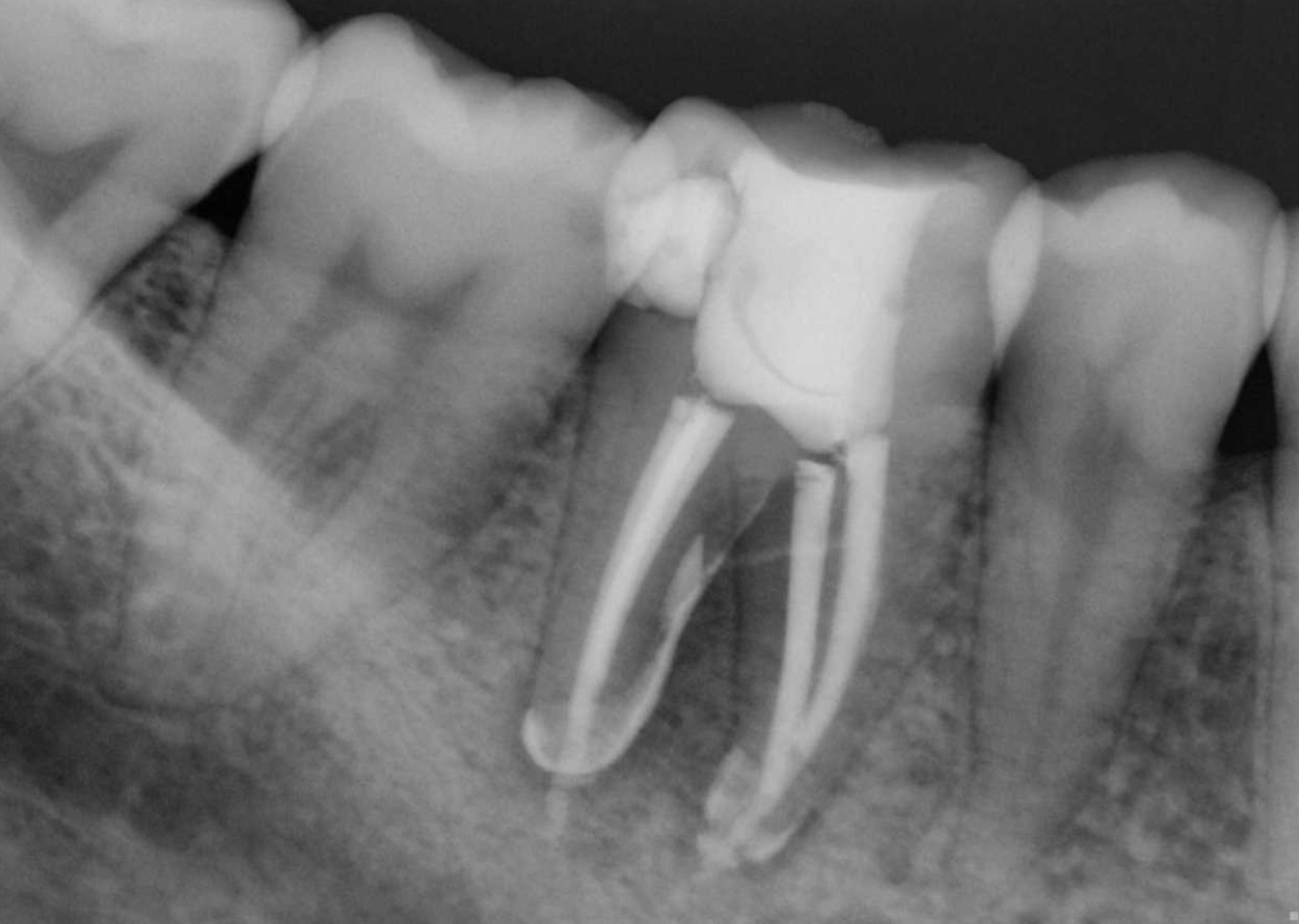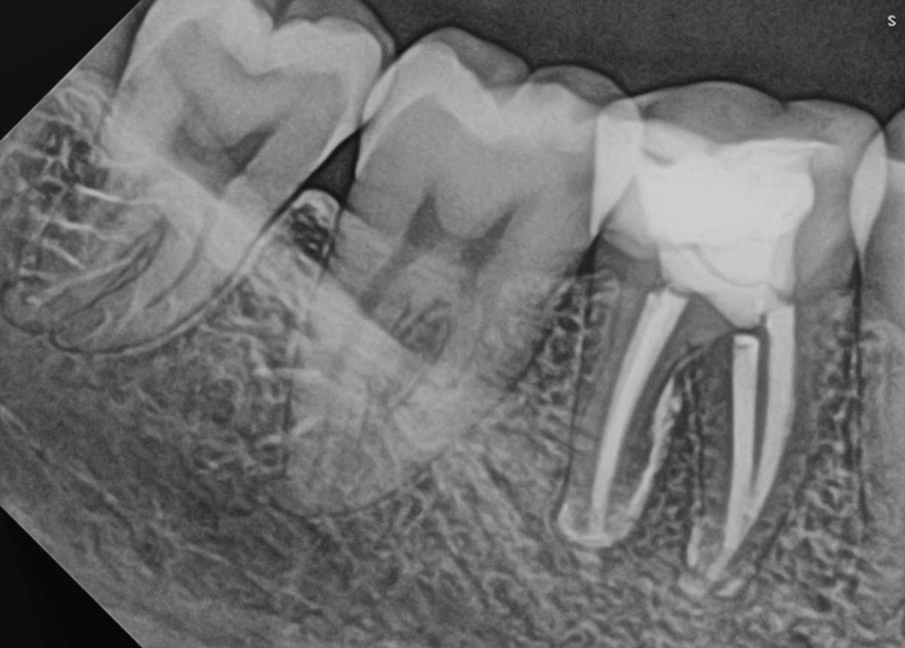 The patient presented to the dental office for a new evaluation of tooth #46. She had previously consulted two dentists, both of whom had recommended extraction. Upon examination, the tooth exhibited grade II mobility and distal caries. Radiographic and tomographic images revealed apical periodontitis in both roots, including the furcation area.