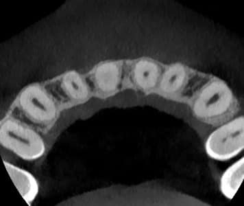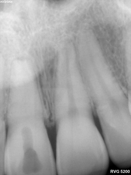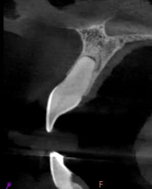 Tooth #11 with a calcified canal following traumatic injury. The tooth was symptomatic with positive percussion. The referring dentist attempted root canal treatment without success. The patient presented with a CBCT scan.