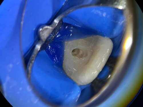 After anesthesia, the access cavity was finalized, and the canal was located using LN burs under the microscope. The canal was shaped with an F1 EdgeTaper Blaze Utopia file, and obturation was performed using hydraulic condensation with Edge Bioceramic Flow. Glass ionomer was placed coronally in the canal for internal bleaching preparation.