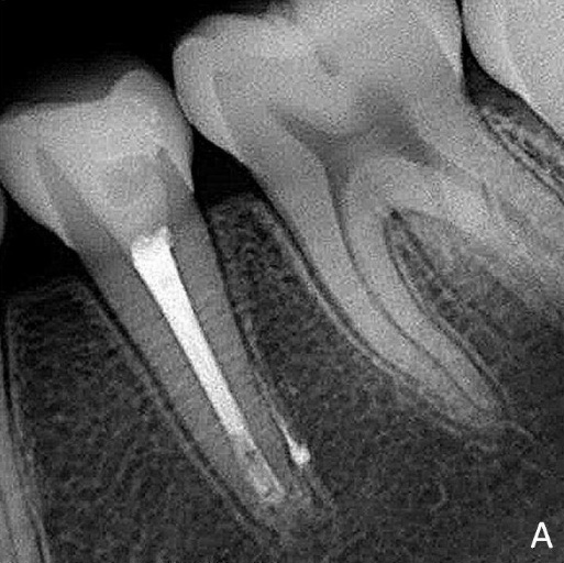 A 12-year-old female patient came to the Dental Hospital of the Federal University of Uberlândia (HO/UFU) reporting a spontaneous, diffuse, intermittent, long-lasting pain exacerbated by chewing plus cold and hot stimuli. Tooth 35 had a coronary access performed in a private dental practice six months earlier. Radiographically, unsatisfactory coronary access, thickening of the periodontal ligament, a diffuse periapical lesion and the presence of an open apex were observed (Figure 1A).