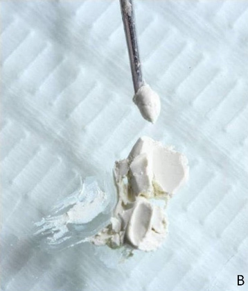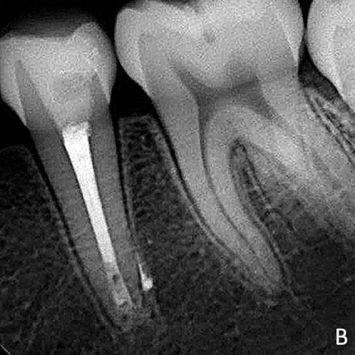 After one month, the patient returned for an intracanal dressing change and a little change was observed in the appearance of the periapical lesion. It was then decided to use a bioceramic intracanal dressing (BIO C TEMP, Angelus) (Figure 2A). Two intracanal dressing changes were performed, with a two-month interval between them (Figure 2B). During the removal of the intracanal dressing in the second change, it was possible to feel the formation of mineralized tissue in the apical region and regression of the periapical lesion.