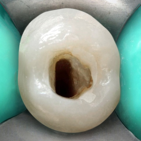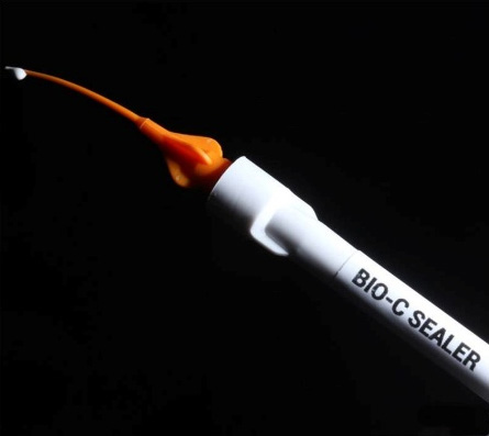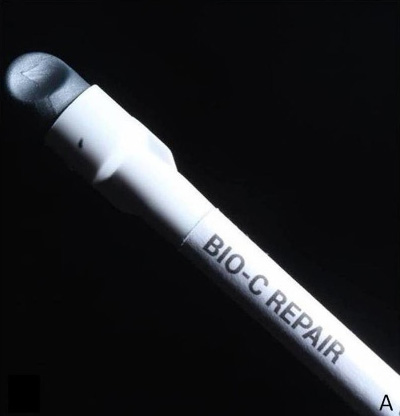 Four months after the beginning of the treatment and 30 days after the last intracanal medication change, the root canal was filled. The bioceramic medication was removed. After the final irrigation and drying of the canal, a plug was made with bioceramic repair cement (BIO-C REPAIR – Angelus) (Figure 3).