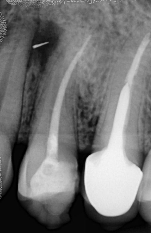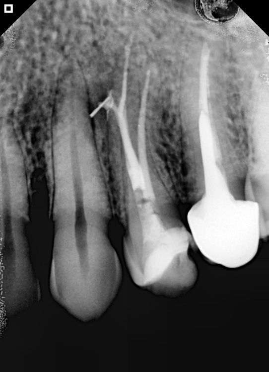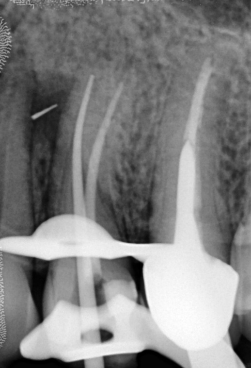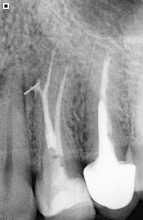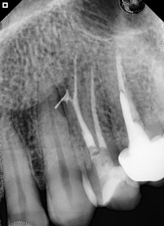 Patient J.E.S., 41 years old, male, referred by an endodontist for evaluation and treatment of palatal root perforation of tooth 24, with file fragment beyond the perforation and periapical lesion.