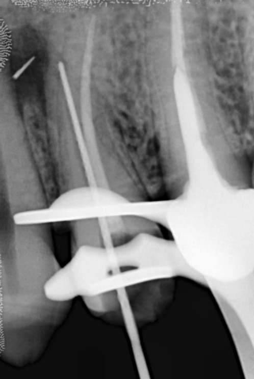 Initial radiograph. Fractured file outside the perforation and presence of periapical lesion.