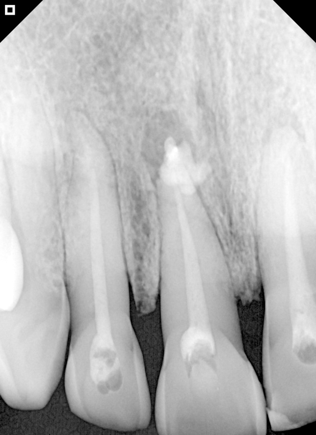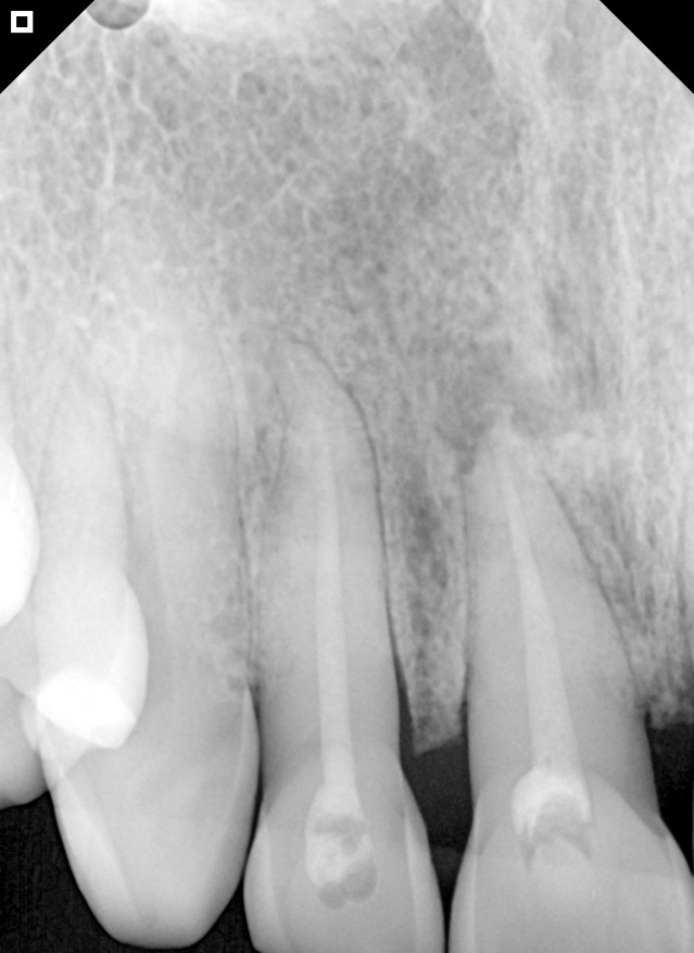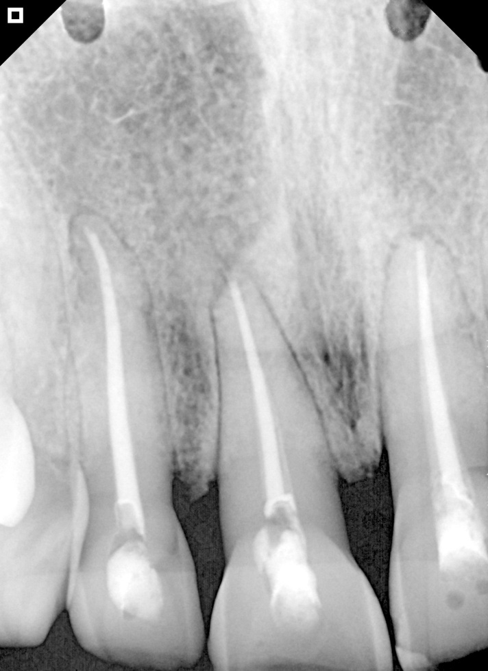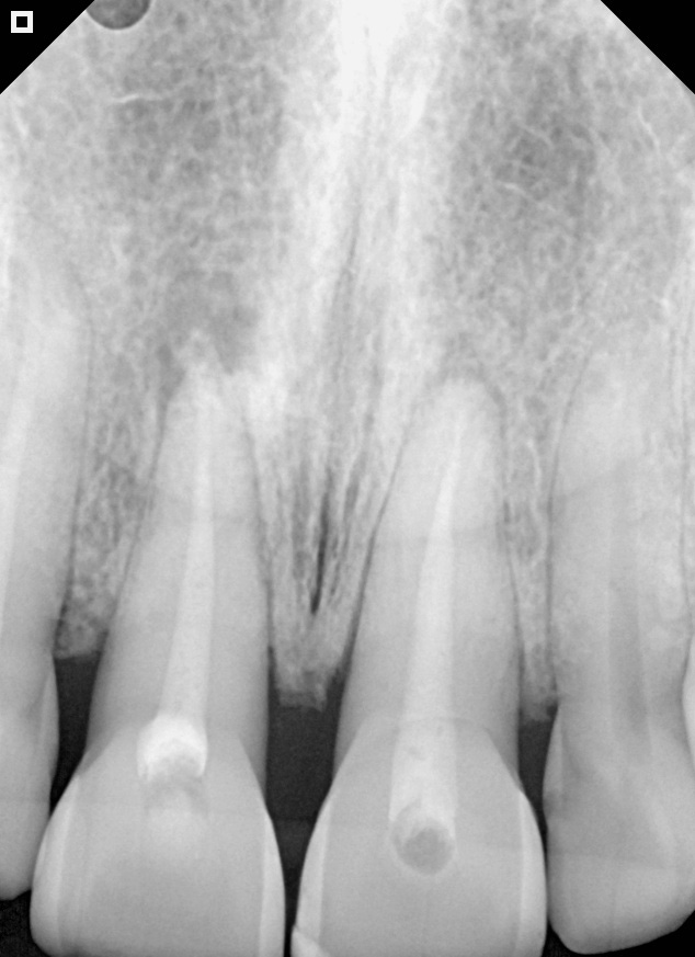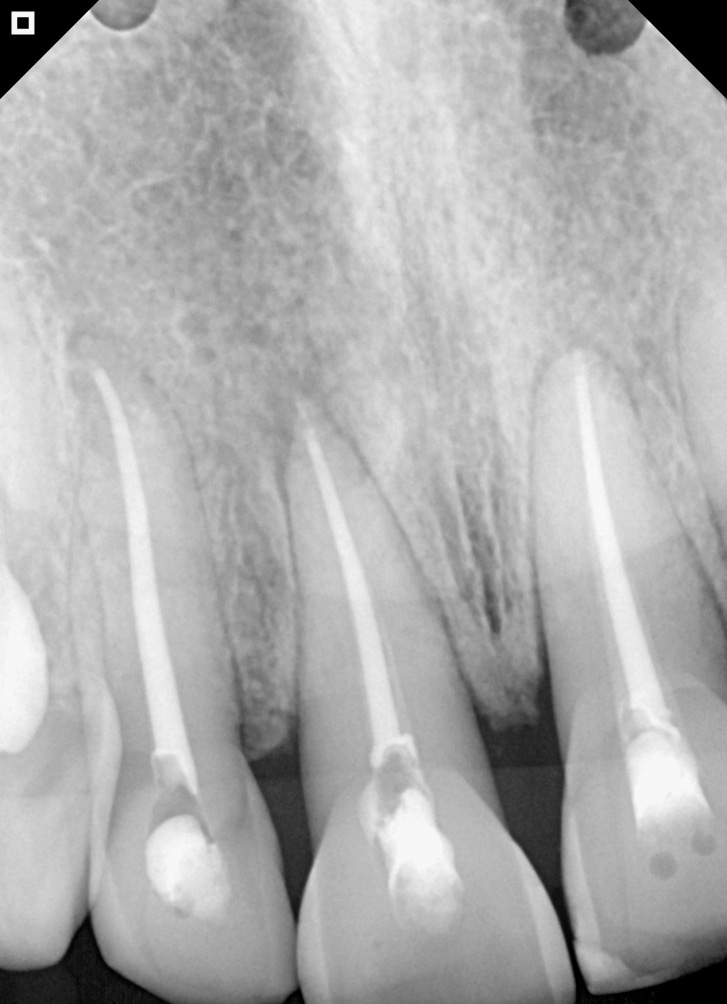 Patient P.S., female, 52 years old, attended the dental clinic complaining of painful sensitivity in tooth 11 and sporadic edema in the sulcus region. The patient also reported a history of trauma (falling off a bicycle) approximately 7 years ago. The clinical examination revealed extensive restoration of the crown of tooth 21 and multiple gingival recessions. The thermal test evaluated the pulp response of the anterior upper teeth, with negative results for teeth 11, 12, and 21. The radiographic examination revealed the presence of periapical lesions in these teeth.