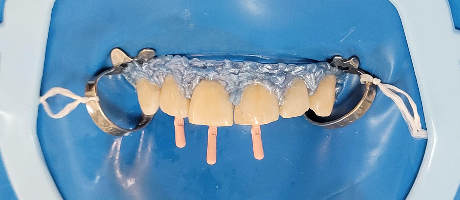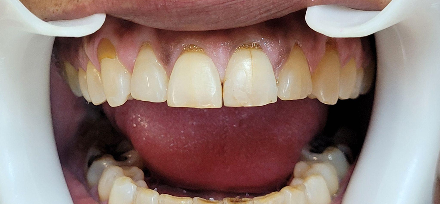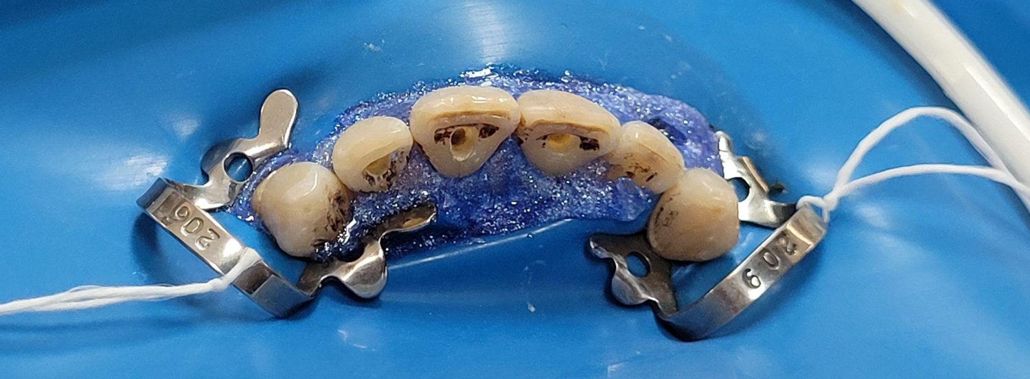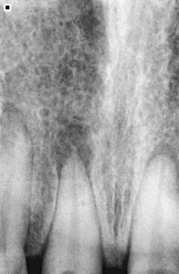 Patient P.S., female, 52 years old, attended the dental clinic complaining of painful sensitivity in tooth 11 and sporadic edema in the sulcus region. The patient also reported a history of trauma (falling off a bicycle) approximately 7 years ago. The clinical examination revealed extensive restoration of the crown of tooth 21 and multiple gingival recessions. The thermal test evaluated the pulp response of the anterior upper teeth, with negative results for teeth 11, 12, and 21. The radiographic examination revealed the presence of periapical lesions in these teeth.