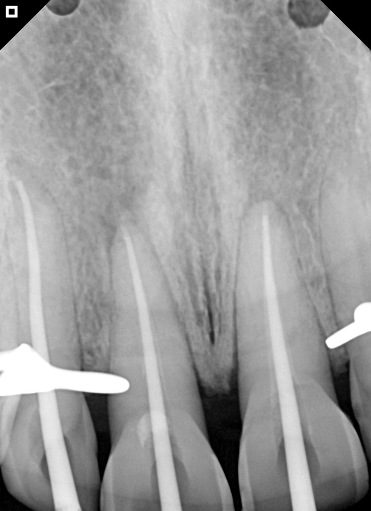 During the obturation session, after removal of the intracanal dressing, passive ultrasonic irrigation (PUI) was performed, alternating between hypochlorite and EDTA. The three elements were filled 1 mm from the root apex with MTA Fillapex bioceramic cement (Angelus), using the hydraulic compression technique. The coronal seal was made with Coltosol (Coltene) and resin-modified glass ionomer.